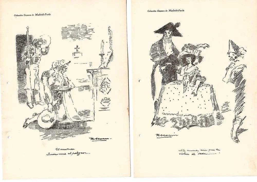 Ricardo Marín Llovet (Barcelona 1874 / 1955 México), pintor y dibujante. Como ilustrador, colaboró en numerosas revistas y diarios como "El gato negro", "Hispania", "Madrid Cómico", "Blanco y negro", "La esfera", "La ilustración hispano-americana". Participó en 1908 en la Exposición General de Bellas Artes, en la nacional de 1912, en varios Salones de Humoristas, como el de 1921… En 1912, fundó El Gran Bufón, de la que también sería director. En 1918 expuso una serie de ilustraciones del Quijote en el Palacio de Cristal del Parque del Retiro. Ricardo Marín realizó folletos publicitarios sueltos para los grandes almacenes Madrid-París, de los que se ven algunos a la venta o en Memoria de Madrid. En este caso, recogen escenas de la capital o de sus alrededores en un claro estilo goyesco.
